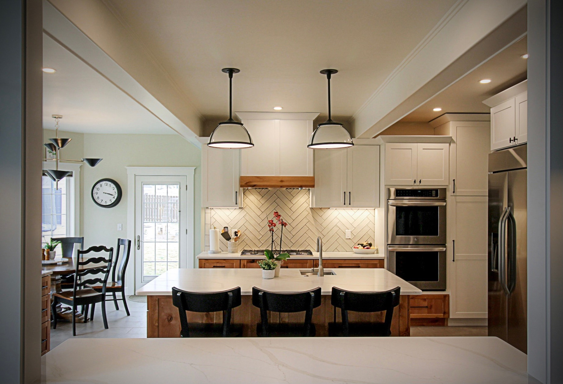 Fall in love with this modern Country Charm Kitchen Cabinet style in this home remodel in Montrose, CO. This was a custom design, so our team worked closely with the client. We used the Pendleton 275 door style with paint grade and rustic alder. The cabinet finish you see is white satin and natural satin. The customer provided their own handle/hinger style.